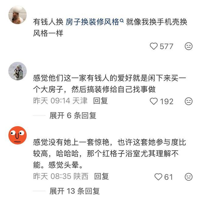 还不如像她姐一样,整一堆无槽洗手池、墙地一体浴室、修道院风走廊……起码大家都能看明白,这钱都用来买智商税了。
